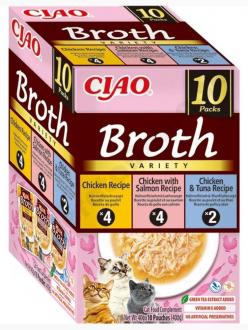 CIAO BROTH Multipack obsahuje 10 kapsičiek natrhaného kuracieho mäsa v lahodnom kuracom vývare.Vyrobené zo 100% čistého kuracieho prsia.Žiadne obilniny, konzervanty ani umelé farbivá.Vysoký obsah vody, ktorý je prospešný pre celkové zdravie mačiek.Nízky obsah kalórií.