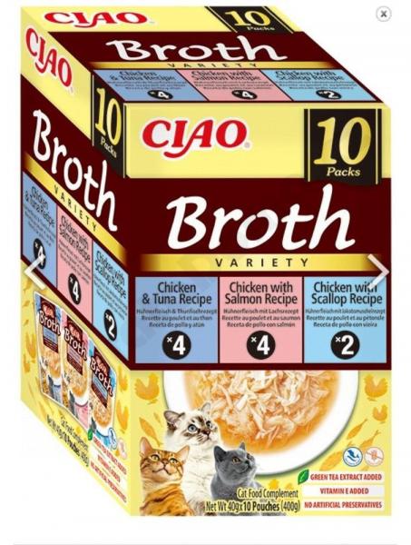 CIAO BROTH Multipack obsahuje 10 kapsičiek natrhaného kuracieho mäsa v lahodnom kuracom vývare. Vyrobené zo 100% čistého kuracieho prsia. Žiadne obilniny, konzervanty ani umelé farbivá. Vysoký obsah vody, ktorý je prospešný pre celkové zdravie mačiek. Nízky obsah kalórií.