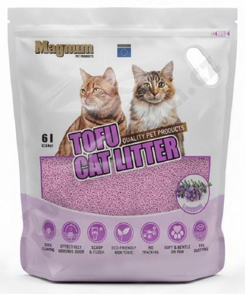 Magnum Tofu Lavender predstavuje modernú a udržateľnú alternatívu k bežným podstielkam. Vyrába sa zo sójovej drviny – vedľajšieho produktu pri výrobe tofu – a je tak šetrná nielen ku mačkám, ale aj k prírode. Vďaka prirodzenej vláknitej štruktúre rýchlo vytvára pevné hrudky, ktoré sa ľahko odstraňujú, čím udržujú toaletu čistú a bez zápachu.