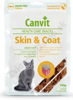 Koža a srsť je prvou ochrannou vrstvou pre telo a iné tkanivá pred vonkajším prostredím. Aby koža mohla plniť svoju ochrannú funkciu, musí mať pre svoj metabolizmus dostatočný zdroj vitamínov, mikroprvkov a aminokyselín ako je biotín, vitamín B2, B3, B5, zinok a metionín. Medzi ďalšiu živinu dôležitú pre zdravú a fungujúcu kožu patrí omega-3 nenasýtené mastné kyseliny, ktoré pôsobia protizápalovo. Maškrta Canvit Skin & Coat Health Care Snack zabezpečuje prísun vitamínov, minerálov, omega 3 nenasýtených mastných kyselín pre zdravú kožu a lesklú srsť, a navyše vašej mačke skvele chutí.